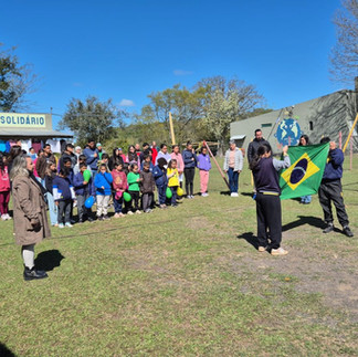 Celebração Cívica (Agosto): Ato solene cívico celebrando a cidadania, o respeito e a união, com assistidos e voluntários prestando homenagem à pátria.